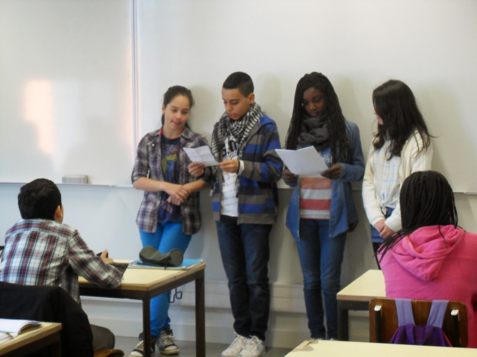 Os alunos do 7º 8, ensaiados pela professora Mª. Eduarda Marques, retribuiram a visita que os colegas lhes tinham feito há algum tempo atrás. Predominaram as leituras em grupo mas foram feitas também algumas apresentações a solo, incluindo a mostra de um poema da autoria do aluno que o leu.