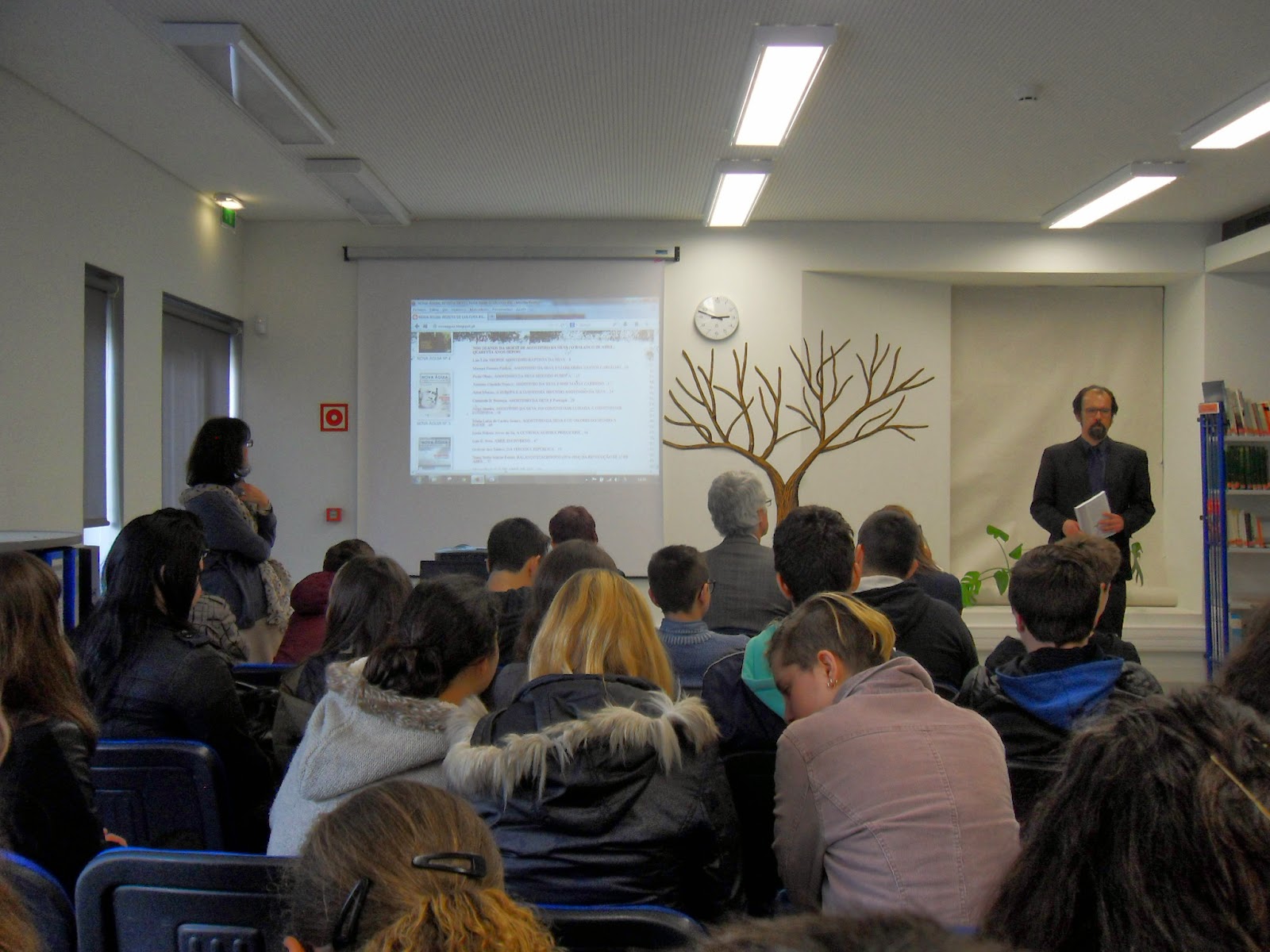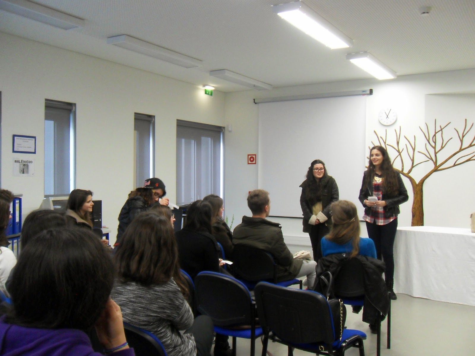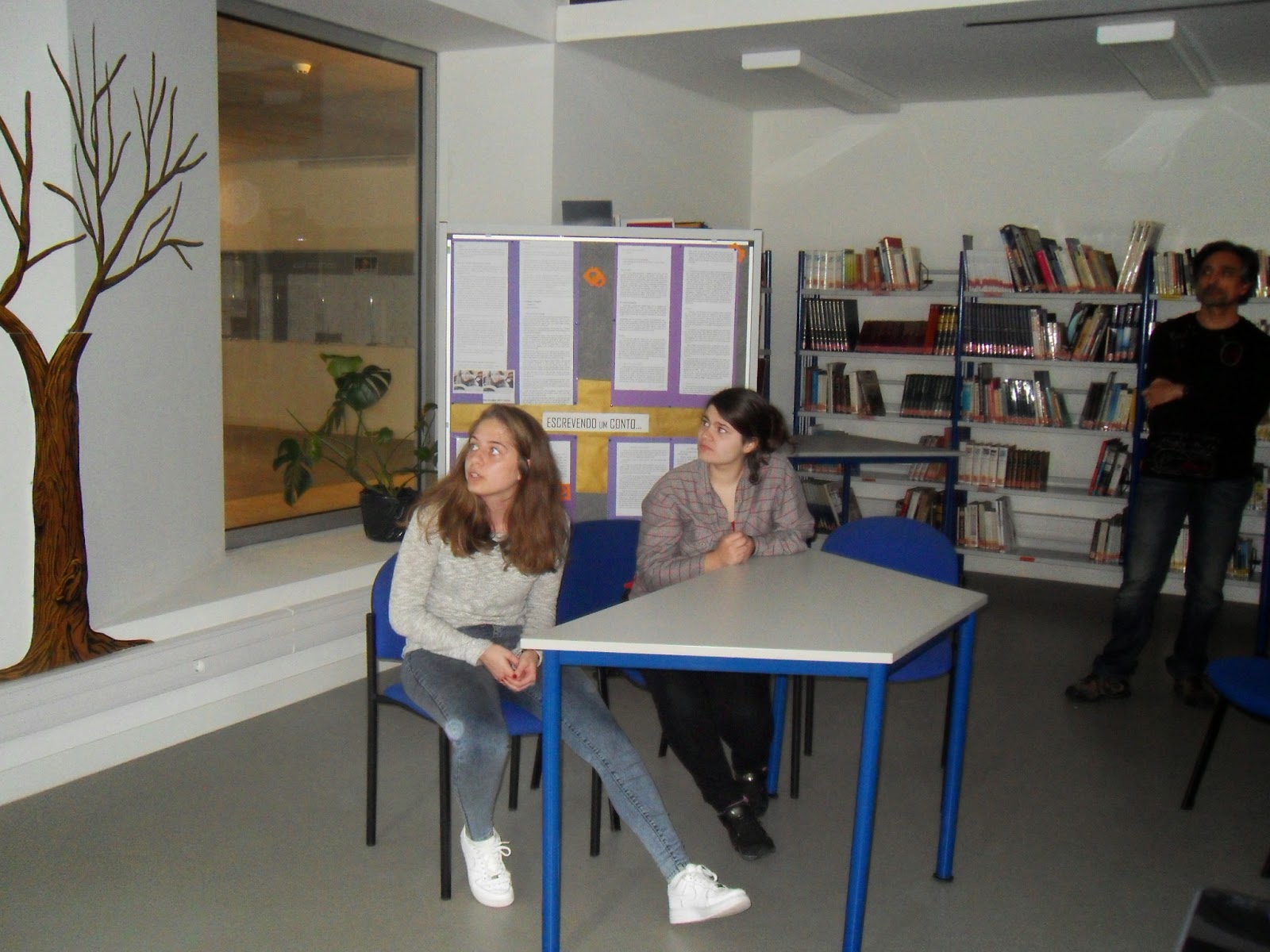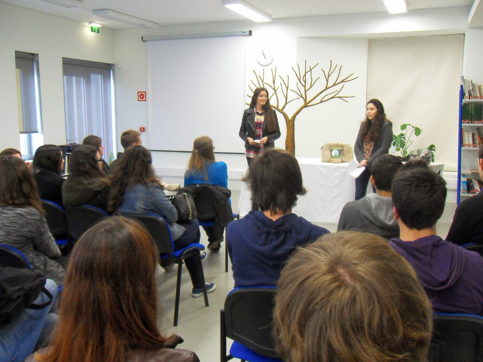 Depois de um rápido enquadramento esboçado pelo professor João Pedro Aido, tomaram a palavra as alunas Ana Carolina e Maria Rita, explicando, de forma muito clara e sucinta, o caminho seguido para a construção dos seus contos: De relevar o facto de ambas terem referido a importância das imagens como fonte de inspiração para a escrita: fotografam mentalmente as personagens e os objetos que constituem o núcleo central da história que querem contar.