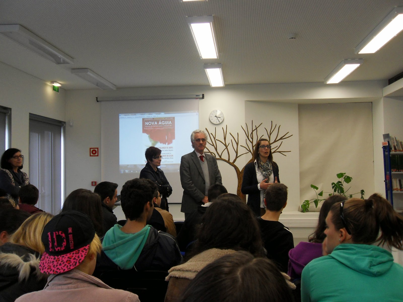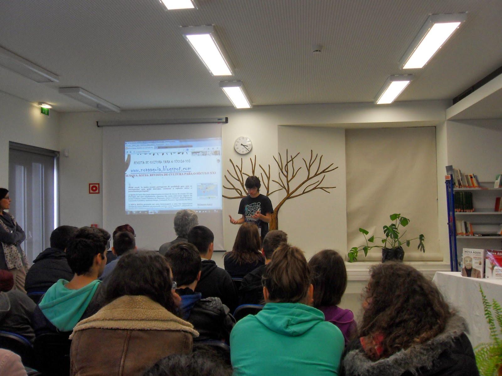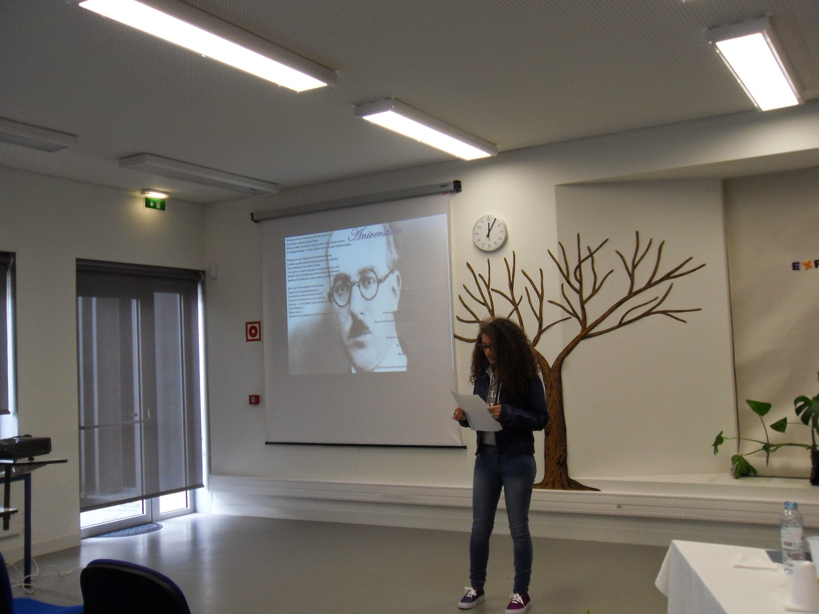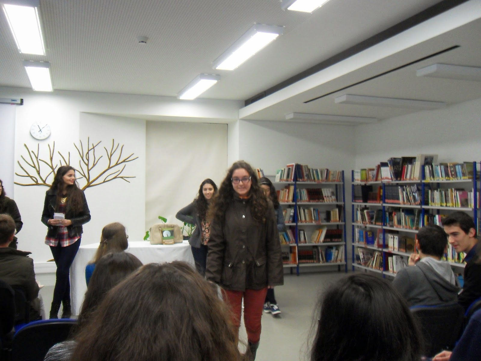 Depois de um rápido enquadramento esboçado pelo professor João Pedro Aido, tomaram a palavra as alunas Ana Carolina e Maria Rita, explicando, de forma muito clara e sucinta, o caminho seguido para a construção dos seus contos: De relevar o facto de ambas terem referido a importância das imagens como fonte de inspiração para a escrita: fotografam mentalmente as personagens e os objetos que constituem o núcleo central da história que querem contar.