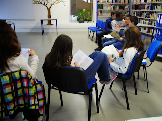 Foi com esta introdução que os alunos do 8º 3 foram informados sobre a a atividade de escrita criativa que devuam desenvolver na aula de Português a decorrer na biblioteca.