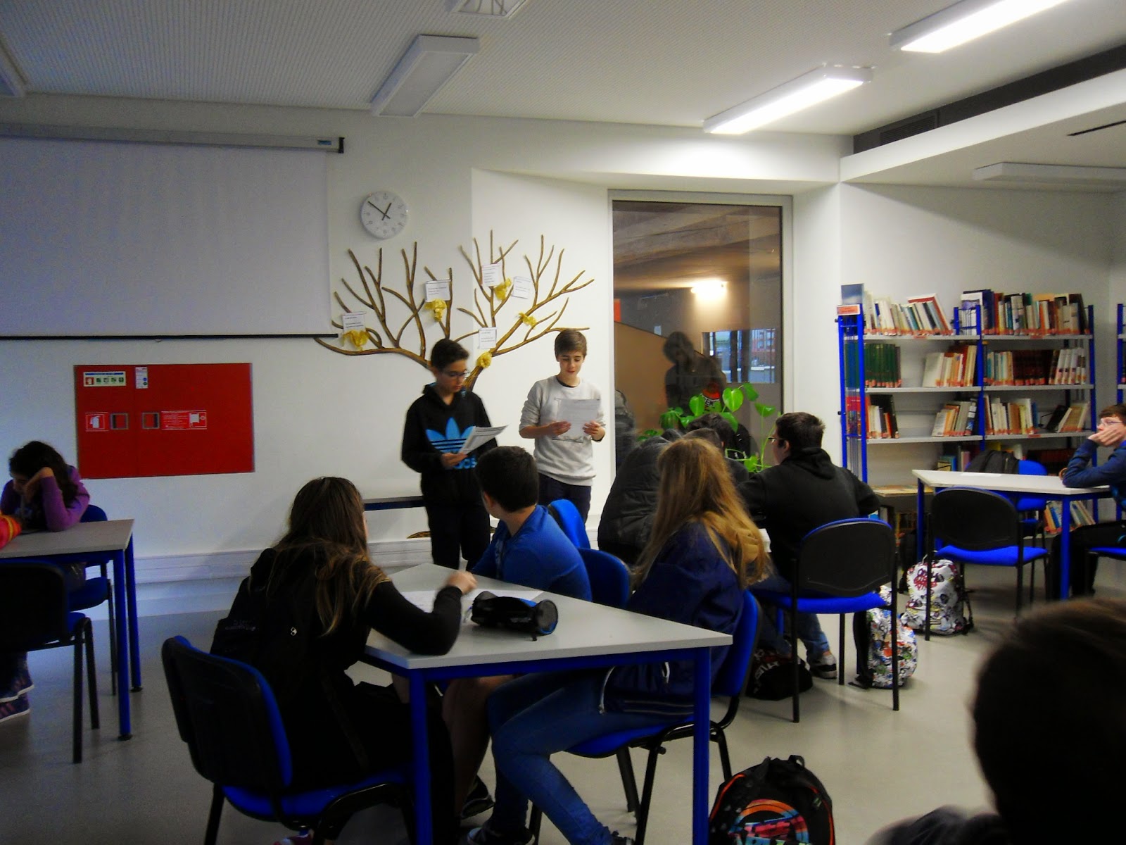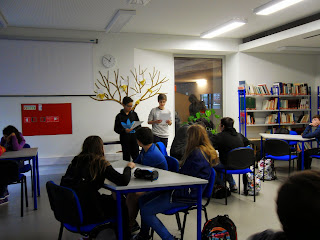 Alguns alunos da turma 3 do 8º ano apresentaram os trabalhos de texto publicitário, realizados na aula de Português com a professora Lurdes Sanches, para os seus colegas do 10º 6, alunos da mesma professora. Foi uma partilha interessante, quer pelo conteúdo original dos seus textos, quer pela experiência de comunicação oral fora do contexto da sua sala de aula.