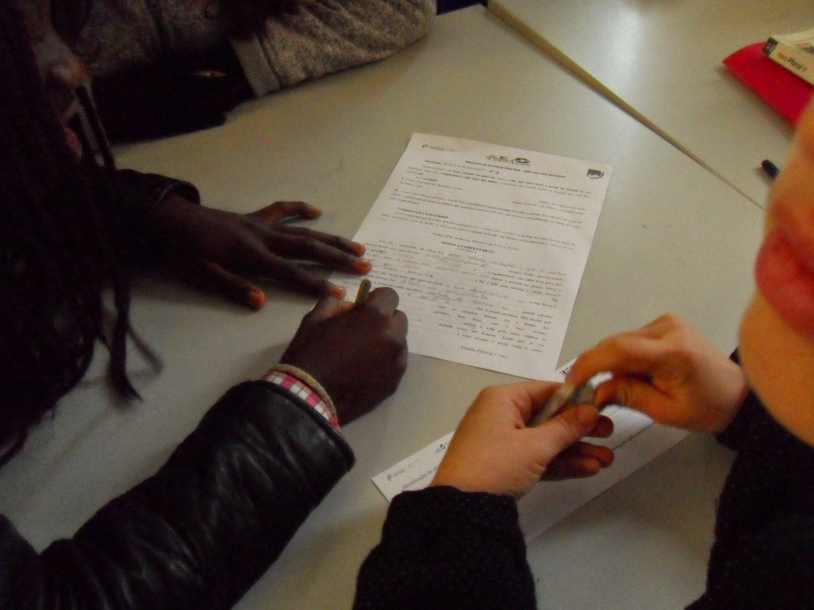O exercício proposto para a turma 3 do 9º ano consistia em completar partes de um texto em que algumas palavras tinham sido deliberadamente "cortadas" mas mantendo a percetibilidade do conteúdo.