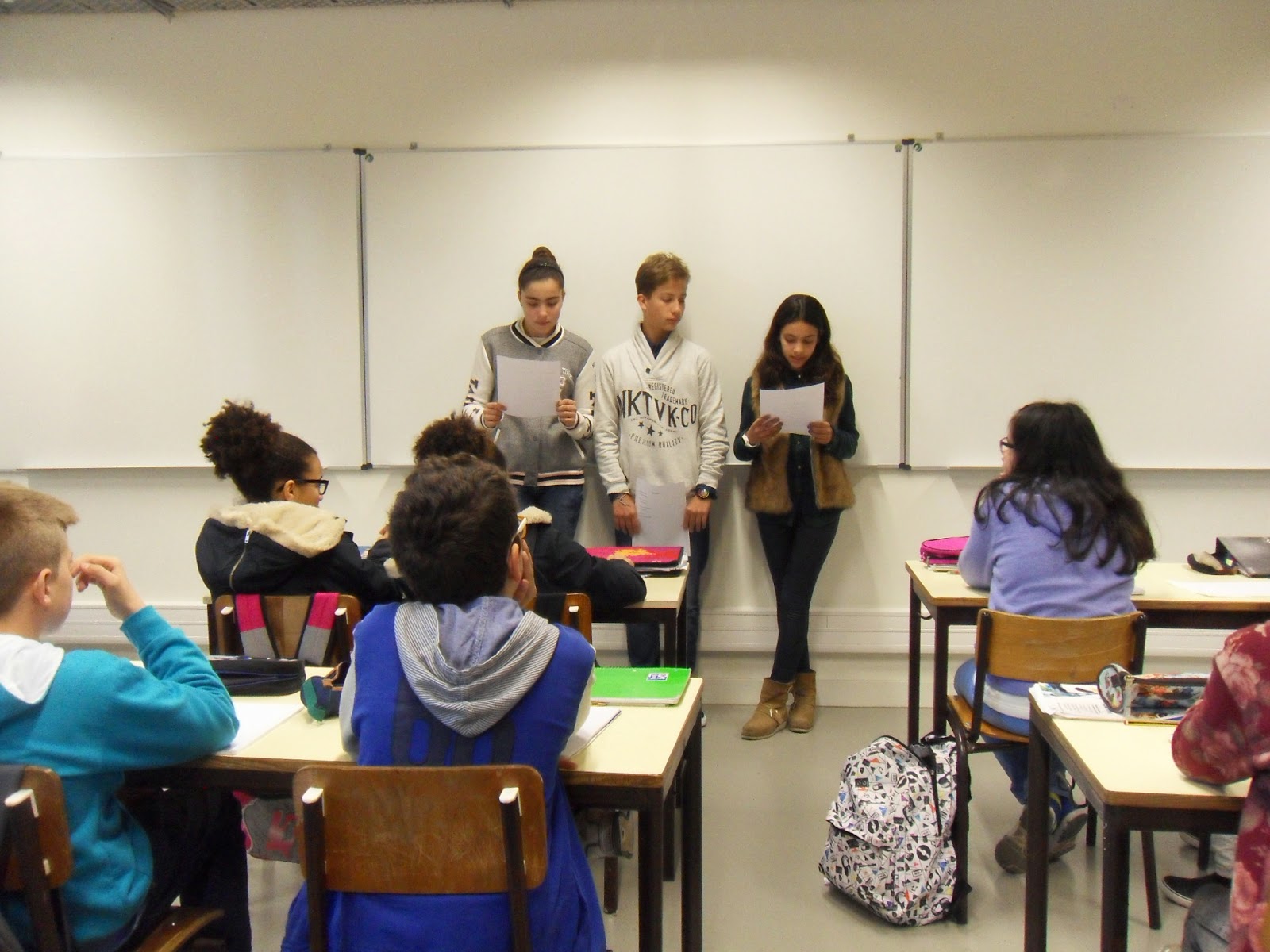 Na Semana da Leitura, alguns alunos da turma 2 do 7º ano deslocaram-se às salas de aula de outras turmas para partilharem com os colegas os textos produzidos a partir da leitura de poemas de autores como Luisa Ducla Soares, Sofia de Mello Breyner Andresen, entre outros.
